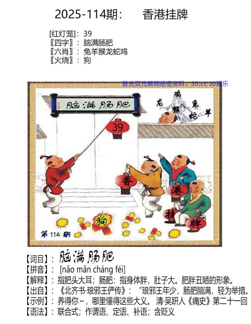 | 114期〖挂牌成语〗 解释:指肥头大耳;肠肥:指身体胖,肚子大。肥胖丑陋的形象 生肖:猴龙蛇兔羊鸡  |